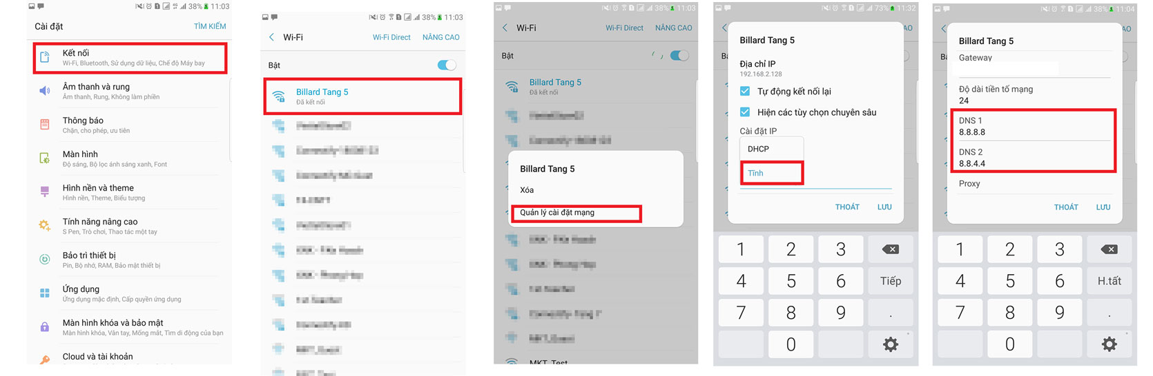 Bước 5: Kéo xuống dưới cùng, bạn sẽ thấy mục DNS 1 và DNS 2. Bạn có thể đổi DNS là dãy số nào tùy thích. Trong hình là DNS của Google
